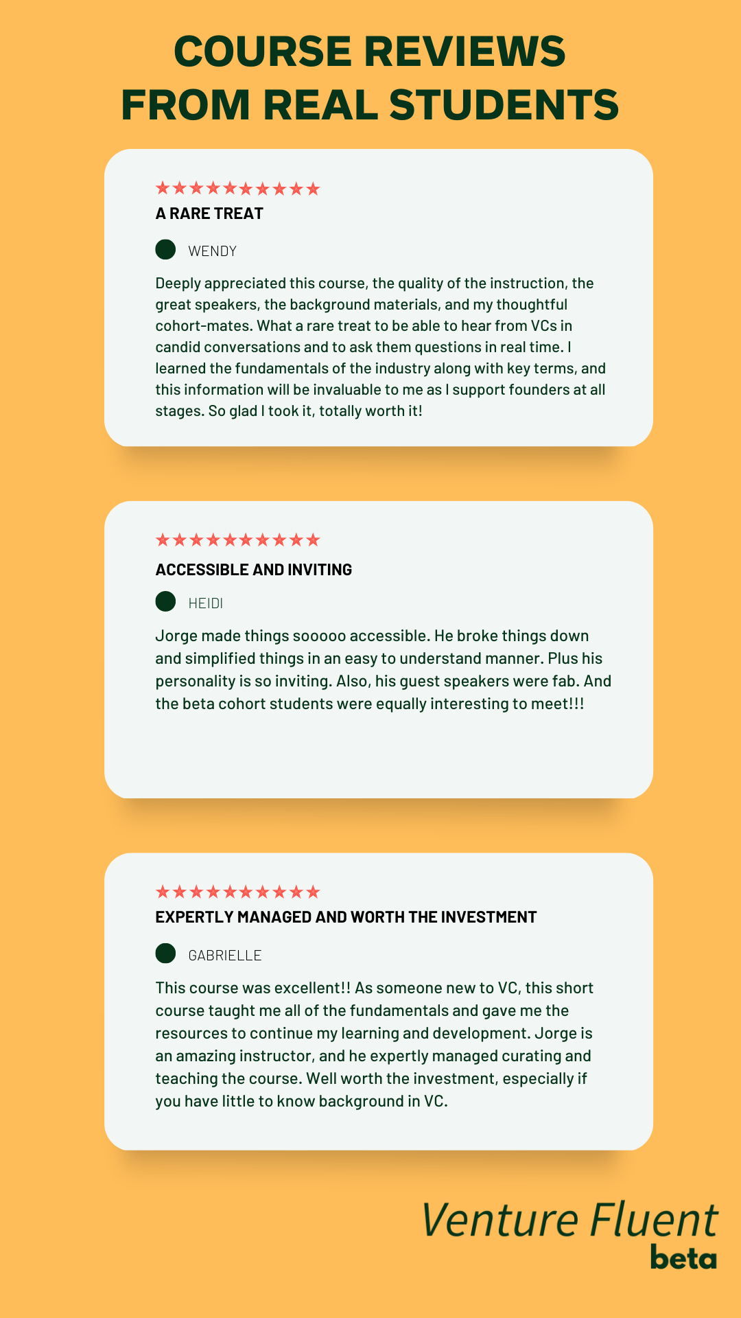 One of the outcomes of Venture Fluent is the course equips students with insights from experienced investors they can use immediately in their own investing careers. A common theme from the reviews above, and across all the reviews of the course, was the high quality of the guest speakers who joined the Beta cohort.